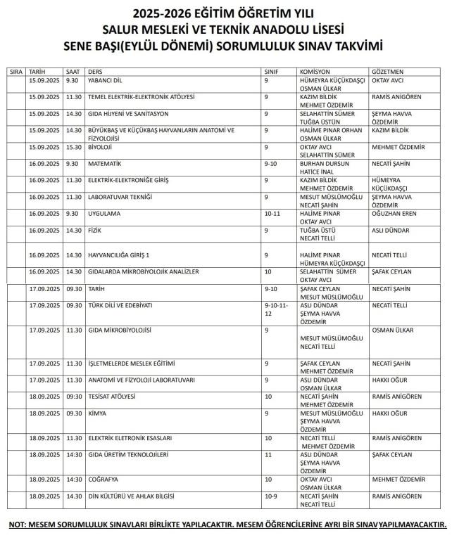 2025 2026 EĞİTİM ÖĞRETİM YILI EYLÜL DÖNEMİ SORUMLULUK SINAV TAKVİMİ